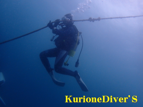 みんなで固まってロープ潜降。水中は真っ暗です。水中ライト使用でお互いが確認できますが、とりあえずブイ下まで行って様子見。