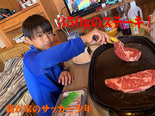 我が家の恒例ご褒美は1位=ステーキ1人締め!350gのステーキしかなく1人1枚購入。
